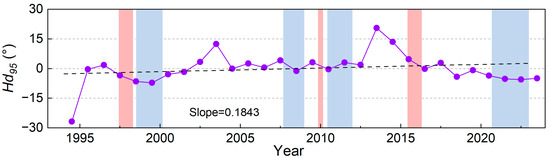 Shoreline evolution is driven by gradients in longshore sediment flux, with oblique wave incidence inducing longshore sediment transport. The resulting longshore currents, generated by wave breaking, serve as the primary mechanism for sediment transport. The stability of longshore sediment transport largely depends on the prevailing wave direction. However, shifts in Hd caused by climate variability result in interannual anomalies in longshore sediment transport, thereby influencing the long-term evolution of sandy shorelines. Additionally, anomalies in storm wave direction can significantly alter longshore currents, affecting the redistribution of beach sediments along the coast. For example, around 2003, a notable shift in Hd95 occurred, with a counterclockwise shift of 12.43° (Figure 22). During this period, extreme wave conditions predominantly from the east contributed to considerable net erosion of the coast (Figure 11).