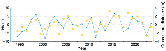 Comparison between annual average mean wave direction (blue line) and cross-shore shoreline distance (yellow dot) from 1994 to 2023.