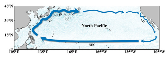 Scope of the study region. The surface wind-driven primary ocean currents in this region include the Kuroshio Current (KC), the Kuroshio Current Extension (KCE), the California Current (CC), and the North Equatorial Current (NEC).