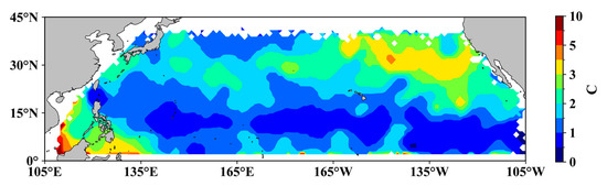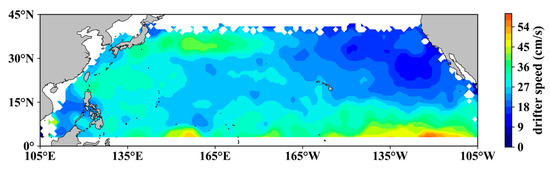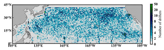 The study area is the North Pacific (105° E–255° E, 0° N–45° N, Figure 1). Using the Six-Hourly Interpolated Drifter Data provided by NOAA’s DAC (https://www.aoml.noaa.gov/phod/gdp/interpolated/data/all.php (accessed on 23 February 2023) [36], a total of 11,843 drifter trajectories (from January 2011 to December 2020) were analyzed.