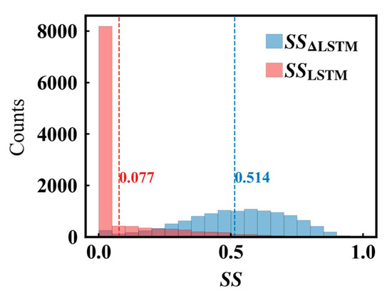 Comparisons between SSΔLSTM and SSLSTM. The blue and red dashed line represent the mean of SSLSTM, and SSΔLSTM, respectively.