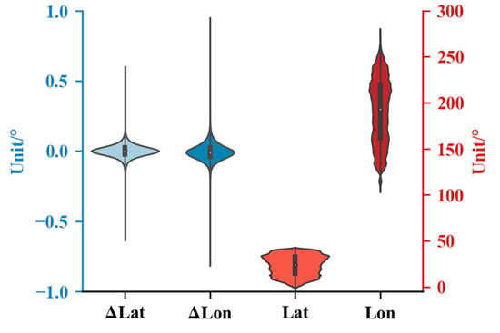 The difference in predictions might be attributed to the varying data distributions of the inputs. The data distribution of all datasets and datasets is shown in Figure 6. T The latitude and longitude data were standardized from their original ranges of 0°–50° and 100°–300° () to −1°–1° (). The data of follow a more normal distribution, which makes it easier for the LSTM model to learn and adapt to variations in different trajectories [40,41].
