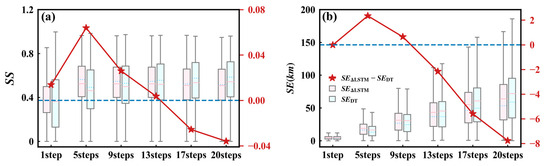 (a) SS for different prediction lengths; (b) SE for different prediction lengths. The pink and blue bar charts represent the distribution of evaluation values for trajectories predicted using LSTM and DT, respectively. The solid pink line indicates the mean, while the dashed light blue line indicates the median. The red curve shows the variation in the difference between the mean evaluation values of the two methods, using the right Y-axis.