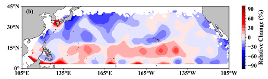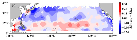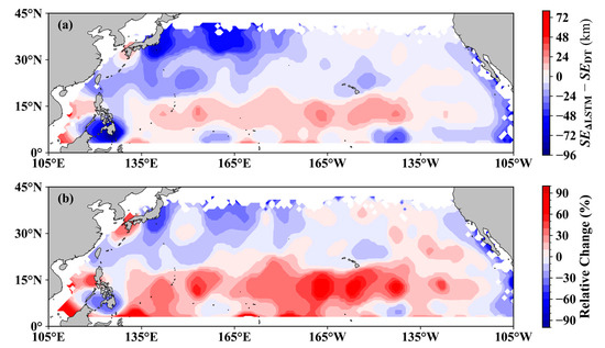 (a) Spatial distribution of the difference between SSΔLSTM and SSDT; (b) relative change in SSΔLSTM with respect to SSDT.