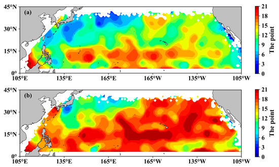 (a) Spatial distribution of the equal-step number between SSΔLSTM and SSDT; (b) spatial distribution of the equal-step number between SEΔLSTM and SEDT.