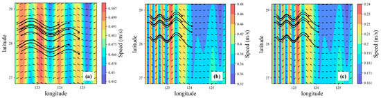 Idealized ocean current fields. (a) Fast and straight current, (b) fast and curved current, (c) slow and curved current. The black lines denote the particle drifting paths. Note that the color bars for current speed differ between the panels.