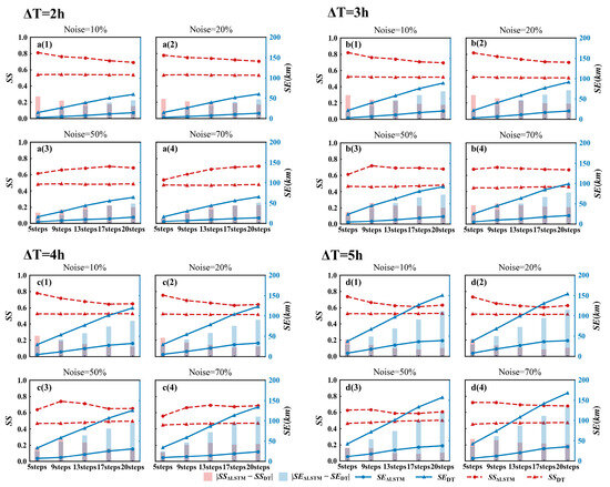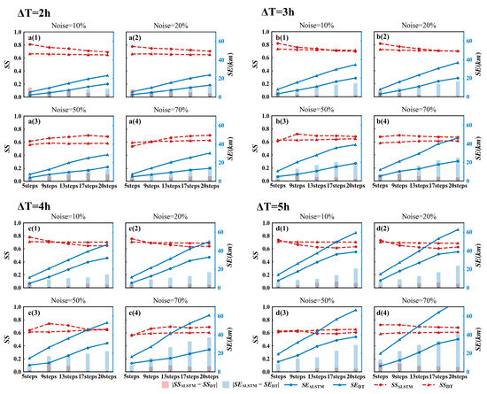 As noise levels increase, the predictive performance of both models is significantly affected, with the SE showing a more pronounced increase in the fast–straight and fast–curved flow fields. Compared to DT, LSTM demonstrates greater stability, indicating that LSTM has a higher tolerance for positional errors under high noise conditions. In contrast, DT’s position predictions are more heavily impacted by complex flow fields. However, the SS remains relatively stable in the fast–straight and fast–curved flow fields, suggesting that both models are less affected by noise when predicting the overall trajectory shape.
