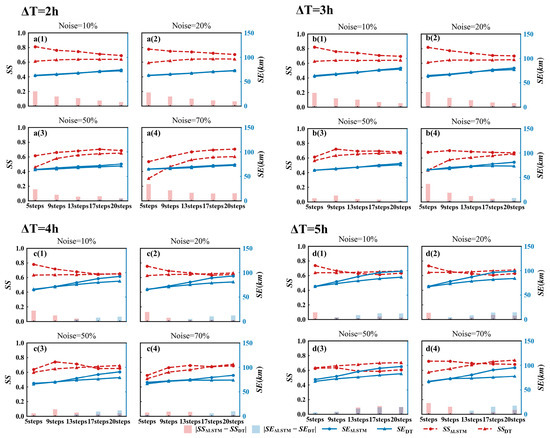 Influence of different time resolution and noise level on prediction in fast and straight current field. The red solid line represents the SS, while the blue solid line indicates the SE. Triangular markers denote the predictions from the DT model, while circular markers denote predictions from the LSTM model. The red and blue bar charts represent the |SSLSTM − SSDT| and |SELSTM − SEDT|, respectively.