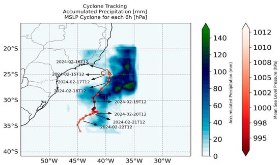 Based on the MSLP fields, the cyclogenesis of Akará’s precursor occurred near the coast of southeastern Brazil at 1200 UTC on 15 February 2024, with a central pressure of 1014 hPa (Table 1). Its cyclolysis was registered at 0000 UTC on February 23, already away from the Brazilian coast, resulting in a total lifetime of 7 days and 12 h. The cyclone followed an anomalous trajectory towards the southwest over the South Atlantic Ocean (Figure 1), covering a total distance of 1971 km with an average speed of 11 km h−1. Throughout its lifetime, the cyclone produced precipitation that was more intense on the right side of its center, and this rainfall did not affect the continental area (Figure 1).