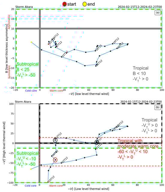 CPS from 1200 UTC on February 15 to 0000 UTC on 23 February 2024. (a) Diagram for B × the −|VTL| and (b) for −|VTU| × −|VTL|. The green dashed line marks the area of the CPS indicative of subtropical cyclones over the South Atlantic Ocean, the black dashed line indicates the area for tropical cyclones using the classic approach, and the red dashed line represents the area for moderately warm core tropical cyclones. This latter overlaps with the other two areas in the −|VTU| × −|VTL| diagram (b). The cyclone’s initial position in the diagrams is indicated by a red circle, and the final position by a yellow circle. In (b) the black circles indicate the start and end of the tropical phase using the classic approach.
