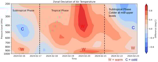 Vertical cross-section of the zonal deviation of air temperature (°C) during the cyclone’s lifecycle. Dashed vertical lines indicate when the cyclone has a phase change.