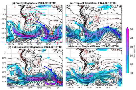 Mean sea level pressure (hPa; black lines), 1000–500 hPa thickness (red dashed lines [>540 dam], and blue dashed lines [≤540 dam]), wind speed at 250 hPa (>30 m s−1, shaded) during the cyclone’s phases: (a) pre-cyclogenesis at 1200 UTC on 14 February, (b) subtropical cyclogenesis at 1200 UTC on February 15, (c) tropical transition at 0600 UTC on February 17, and (d) intense tropical phase at 1800 UTC on 19 February 2024. Letters L and H indicate low and high-pressure systems, respectively. Cold front is indicated with blue color, warm front with red, and occluded front with purple.