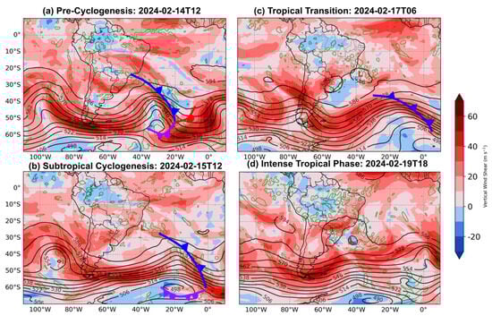 Vertical wind shear between 200 and 850 hPa (m s−1; shaded), divergence at 250 hPa (>2 × 10−5 s−1; green lines), and geopotential height at 500 hPa (dam; black lines) during the cyclone’s phases: (a) pre-cyclogenesis at 1200 UTC on 14 February, (b) subtropical cyclogenesis at 1200 UTC on February 15, (c) tropical transition at 0600 UTC on 17 February, and (d) intense tropical phase at 1800 UTC on 19 February 2024. L indicates the location of the cyclone center. A cold front is indicated with blue color, warm front with red, and occluded front with purple.