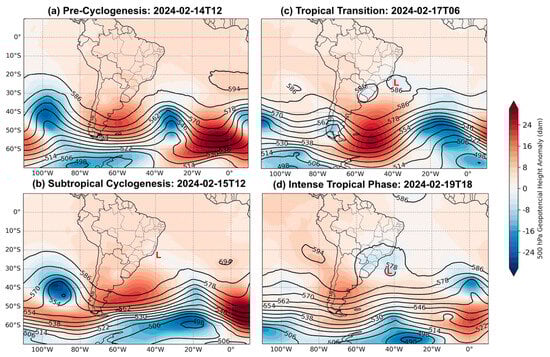 Geopotential height anomaly at 500 hPa (dam; shaded) using the climatology of 2004–2023, and geopotential height (dam; black lines) during the cyclone’s phases: (a) pre-cyclogenesis at 1200 UTC on 14 February, (b) subtropical cyclogenesis at 1200 UTC on 15 February, (c) tropical transition at 0600 UTC on February 17, and (d) intense tropical phase at 1800 UTC on 19 February 2024. L indicates the location of the cyclone center.