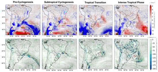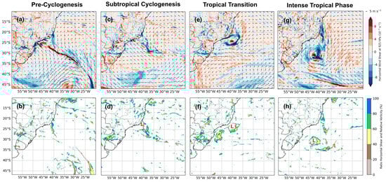 The upper-level divergence, although not vigorous, may have coupled with other near-surface processes. Specifically, the passage of the cold front produced near-surface convergence and cyclonic relative vorticity, which remained in the region due to the contribution of horizontal wind shear caused by the interaction between the northeasterly winds from the SASA and the southerly winds from the post-frontal anticyclone (Figure 7). From the pre-cyclogenesis period to the day of cyclogenesis, the contribution of the horizontal wind shear to the total cyclonic relative vorticity ranges from 40% to ~100% in the genesis region (Figure 7a–d). Therefore, it was the main dynamical driver for cyclogenesis. This physical process was also important for Iba’s genesis, the first pure tropical cyclogenesis over the South Atlantic Ocean [18], and for tropical cyclones in other ocean basins [45].