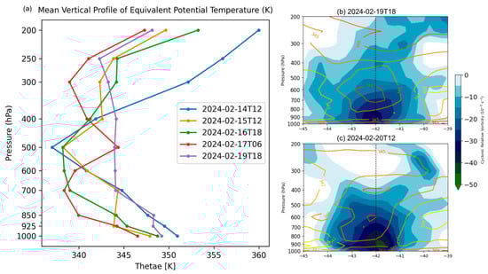 (a) Mean vertical profile of θe (K) for the cyclone’s phases: pre-cyclogenesis at 1200 UTC on February 14, subtropical cyclogenesis at 1200 UTC on 15 February, 12 h before the tropical transition at 1800 UTC on 16 February, tropical transition at 0600 UTC on 17 February, and intense tropical phase at 1800 UTC on 19 February 2024. The mean is calculated using a box with borders 1° away from the cyclone’s center. For the pre-cyclogenesis phase, we used the same center position as for the cyclogenesis. (b,c) vertical cross-section of θe (K, lines) and relative cyclonic vorticity (×10−5 s−1; shaded) considering the central latitude of the cyclone at 1800 UTC on February 18 and 1200 UTC on 20 February.