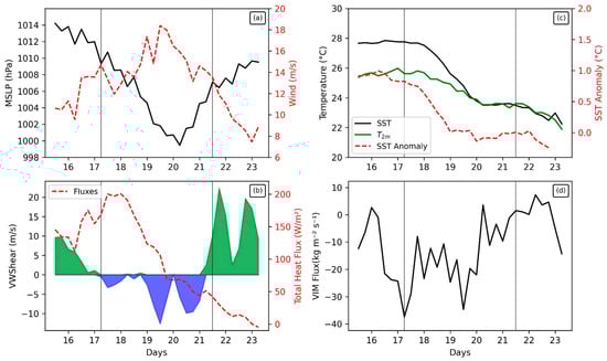 (a) Mininum MSLP (hPa) at the cyclone’s center and maximum 10-m wind speed (m s−1). The variables in the other panels correspond to an areal mean within a 2° box around the cyclone’s center. (b) 250–850 hPa vertical shear of the horizontal wind (m s−1) and total heat flux (W m−2), (c) SST (°C), 2-m air temperature (°C), and vertical temperature gradient (SST–T2m), and (d) vertically integrated moisture flux divergence (10−5 kg m−2 s−1; negative signal indicates convergence). Vertical lines mark the cyclone’s phases: subtropical, tropical, and subtropical. The first vertical line corresponds to the tropical transition (0600 UTC on 17 February), and the second to the subtropical transition (1200 UTC on February 21).