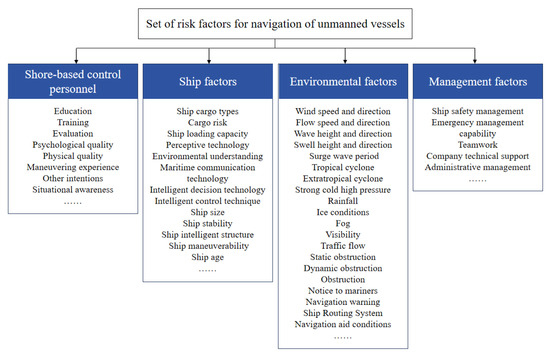 The safe navigation of unmanned ships is mainly affected by the following four factors: shore-based control personnel [19,20], ship factors, environmental factors, and management factors [1]. Based on the analysis of factors affecting the navigation safety of unmanned ships under a complex navigation environment, the navigation risk factor set of unmanned ships is sorted out, as shown in Figure 1, which is mainly divided into four aspects: shore-based control personnel, ship, environment, and management.
