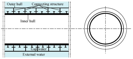 The double shell structure is a prevalent structural form for underwater warships, including submarines, as shown in Figure 1. It consists of a thin outer hull, a pressure-resistant inner hull and some connecting structures that link the inner and outer hulls together. Usually, the cavity between the inner and outer hulls of a submarine is filled with water, referred to as gap water. Underwater explosions are one of the significant threats to a submarine’s vitality and operational efficiency []. For the double-shell structure, its deformation mode changes from the overall large-scale plastic deformation to the local crevasse when the explosion source is from far to near []. The shock response of the double shell with gap water can be divided into four stages under the non-contact underwater explosion []. Stage I: the incident shock wave interacts with the outer shell and penetrates into the gap water, and there is no large area of plastic deformation in the structure. Stage II: the transmission wave in the gap water is reflected by the inner shell, and then it is reflected back and forth between the inner and outer shells. At this stage, the inner and outer shells are rapidly compressed, and local plastic deformation begins to appear. Stage III: The outer shell shows obvious local plastic deformation and is accompanied by the formation of depression. The deformation characteristics of the inner shell are similar to those of the outer shell. At the end of this stage, the local and overall plastic deformation reaches the maximum. Stage IV: Due to the rapid attenuation of the explosion impact load and the increase of the plastic deformation energy of the structure, the inner and outer shells rebound and vibrate under the action of residual stress. In underwater scenarios, both the gap water and the connecting structures between the dual hulls can propagate shock waves, and the load transfer is closely related to the structural impact response. Hence, it is essential to analyze the transmission properties of underwater explosion shock waves in such a configuration to enhance its design, performance, and capacity to withstand underwater explosions.