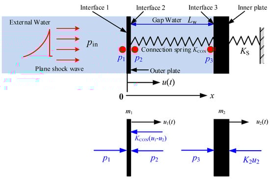 A simplified one-dimensional, double-layer, water-filled plate model with the connecting structure emulated by an elastic spring is built in this section. It can effectively quantify the shock wave’s transmission characteristics across each fluid-solid interface and delineate the transmission contributions of both the gap water and the connection spring. The schematic representation of this simplified double-layer plate model is depicted in Figure 2, which includes external water, double-layer plate, gap water, connecting spring, and the support spring of the inner plate. m1 and m2 are the area density of the double-layer plate, respectively; u1 and u2 are the displacements of the double-layer plate, respectively; p1, p2, and p3 are the pressures at the fluid-solid coupling surfaces 1, 2, and 3, respectively; pin is the incident shock wave; Lw is the distance between the double-layer plate. The connecting structure between the double-layer plate is simulated by a linear connection spring denoted as KCON. The linear spring Ks represents the flexibility of the inner plate. During an underwater explosion, the shock wave can be simulated by an exponentially attenuating wave [].
