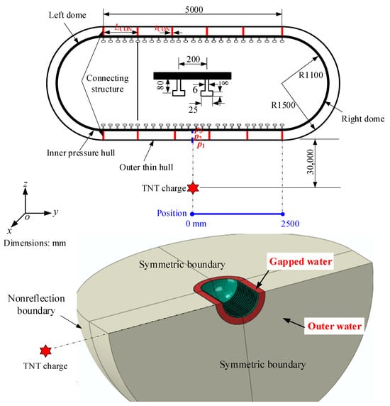 The actual underwater vessel, however, is inherently three-dimensional. In this section, a finite element model of a double-hulled, water-filled cylindrical shell is constructed, as plotted in Figure 3. The numerical model encompasses the inner pressure hull, the outer thin hull, and the connecting structures between them, with water filling the space between the hulls as well as surrounding the outer thin hull. The inner pressure hull and outer thin hull have a thickness of 32 mm and 5 mm, respectively. The radii of inner and outer hull are 1100 mm and 1500 mm, respectively. The thickness of the gap water is 400 mm. The inner pressure hull is internally reinforced with circumferential T-shaped ribs, where the spacing distance of T-shaped ribs is 200 mm. The specific geometric dimensions of the model are delineated in Figure 3. The explosion source is aligned with the center of the cylindrical shell, and the detonation distance is 30 m. The parameters p1, p2, and p3 represent the pressure exerted on the fluid-structure coupling surfaces between the exterior fluid and the thin hull, the gap water and the thin hull, and the gap water and the pressure hull, respectively, as illustrated in Figure 3. Because of the geometric symmetry and load symmetry of the structure, only 1/4 of the finite element model is established to improve the computational efficiency, as shown in Figure 3.