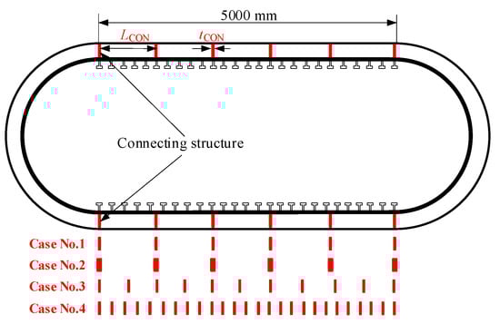 During the underwater explosion event, the shock wave initially impinged on the outer thin hull. The response of the outer thin hull is then transmitted to the inner pressure hull through the gap water and the connecting structures between the hulls. To examine the influence of connecting structures on shock wave propagation, the distribution and geometric dimensions of the connecting structures will be meticulously designed. Two scenarios are considered: one involves adjusting the thickness of the connecting structures while keeping their distribution unchanged, and the other entails altering the distribution of the connecting structures while maintaining their total mass constant. As depicted in the schematic in Figure 4, LCON and tCON denote the spacing distance and thickness of the connecting structures, respectively. The various calculation cases are listed in Table 1. In case No. 0, there are no connecting structures between the two hulls. In cases No. 1 and 2, the spacing distance between the connecting structures is kept constant at 1000 mm, with two different thicknesses of the connecting structures, 5 mm and 20 mm, being evaluated. In cases No. 2, 3, and 4, the total mass of the connecting structures remains constant, while the spacing and thickness of the structures are varied. Thus, narrower spacing results in a thinner structure, and conversely, wider spacing leads to a thicker structure.