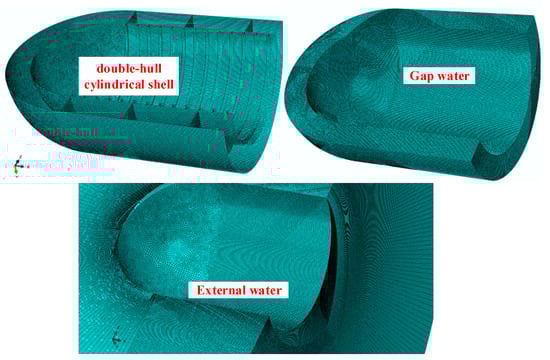 In the finite element model, the structure is discretized by the four-node shell element S4R, and the size of the grid in the two directions of length and width is 20 mm. Water is discretized by the 8-node hexahedral acoustic element AC3D8R. The size of the fluid mesh that fits the structure is 20 mm, which remains consistent with the structure. The size of the fluid mesh along the propagation direction of the shock wave will influence the simulation of the shock wave. The variable density mesh technique is used to divide the fluid mesh along the direction of shock wave transmission. The mesh size close to the structure is 5 mm, and the mesh size far away from the structure near the outer fluid boundary is 40 mm. The finite element mesh schematic of the double-hull water-filled cylindrical shell model is shown in Figure 5.
