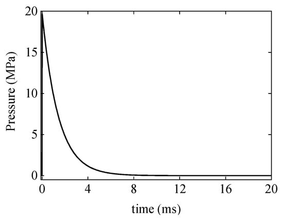 where W and R are the mass and the detonation distance of the explosive charge. The parameters of K1, K2, A1, and A2 are constants depending on the explosive type. For TNT explosive, these constants are K1 = 53.4, K2 = 0.0925, A1 = 1.13, and A2 = −0.22. The profile of the calculated incident shock wave is illustrated in Figure 6.