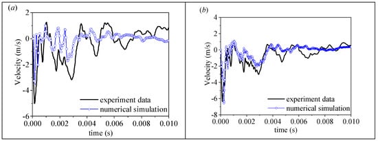The experiment model is built by Abaqus/Explicit 2022, where the diameter of outer water is 6 m. In the finite element model, the double-hulled, water-filled cylindrical shell is discretized by a 4-node shell element with a grid size of 10 mm. Water is discretized by 8-node hexahedral acoustic elements. Its mesh size along the shock wave propagation is 5 mm near the inner face and 40 mm for the rear face. The comparison results between the numerical simulations and the experiment for measuring point A2 are plotted in Figure 8. Good agreements for the velocity profile are observed in these figures. The results indicate that the acoustic-structural coupling method in Abaqus/Explicit 2022 can simulate the mid-far field underwater explosion problem.