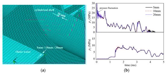 The mesh sensitivity analysis of the numerical model is conducted in this section. The mesh of the model includes structural shell mesh and fluid acoustic mesh. The shell mesh size is 20 mm, which can meet the accuracy requirements. The fluid acoustic meshes have a shape of hexahedral. The fluid mesh size of the fluid-structure coupling surface is consistent with the structure, which is 20 mm. The fluid mesh size along the direction of shock wave propagation is important for the shock wave propagation, which will be analyzed in this section. The schematic diagram of structural and fluid finite element meshes is shown in Figure 9a, where the gap water is omitted. Three different mesh sizes of 5 mm, 10 mm, and 20 mm for water along the direction of shock wave propagation are considered, and the mesh size of outer water shown in the figure is 5 mm. The mesh size for a double-hulled cylindrical shell is 20 mm. The fluid mesh size mainly affects the shock wave transmission in the water field, which in turn affects the impact response of the structure. Therefore, the shock wave pressure in the water field is used to evaluate the influence of grid size. Figure 9 shows the influences of the fluid mesh sizes on the predictions of the wet face pressure history, where p1 and p3 respectively denote the outer surfaces of the outer thin hull and inner pressure hull. The results indicate that the fluid mesh size along the shock wave propagation direction has an effect on the shock wave transmission. When the mesh size is 20 mm, as plotted by the blue dotted line in the picture, the fluctuation of the shock wave is more obvious. When the fluid mesh size is 5 mm, the pressure fluctuations are much less, and it is sufficient for providing accurate fluid responses.