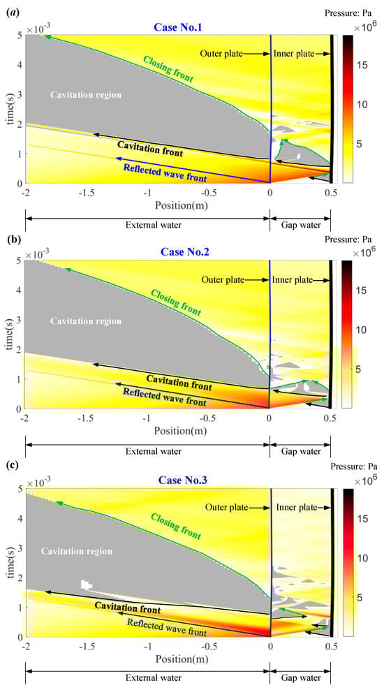 The temporal and spatial distribution of fluid pressure in the external and gap water regions for cases 1 to 3, where the stiffness of Ks is soft, are depicted in Figure 10. Within the color map, the blue line at 0 m and the black line at 0.5 m position illustrates the motion trajectories of the double-layer plates, respectively. The black and green arrows indicate the cavitation wave front trajectory and the closing front trajectory, respectively. The observations from Figure 10 show that the shock wave is both reflected and transmitted as the incident wave acting on the outer plate. The motion of the front plate will transfer the load to the rear plate through KCON, so that the rear plate also begins to move. Almost concurrently, the gap water in proximity to the inner plate initiates cavitation and extends towards the external plate due to the motion of the rear plate. This phenomenon arises since the connection spring KCON instantaneously transmits the load to the inner plate. This type of cavitation is termed “static cavitation” since the shock wave in water has not yet been transmitted here. The effects of such cavitation are weak. Concurrently, the wave transmitted by the gap water advances towards the inner plate. When the transmitted wave meets the static cavitation front, the static cavitation begins to collapse, and the collapsing front propagates towards the inner plate. As the transmitted wave acts on the inner plate, it undergoes rapid acceleration, inducing new cavitation adjacent to the inner plate that then spreads towards the outer plate. When the closing front arrives at the external plate, the velocity of the external plate increases rapidly, resulting in the cavitation of external water adjacent to the external plate. This cavitation front then moves away from the outer plate. Given the deceleration of the outer plate, the cavitation near it starts to collapse. In scenarios involving a stiffer connection spring KCON, as illustrated in Figure 10c, cavitation within the external water manifests later but undergoes earlier collapse.