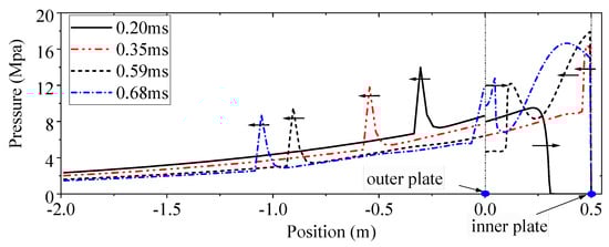 The pressure distribution at various time instants for case 1 in both external and gap water is illustrated in Figure 11, where the positions at 0 m and 0.5 m correlate with the locations of the double-layer plate, respectively. At a time instant of t = 0.2 ms, the incident shock wave strikes the outer plate and is reflected, where a pronounced reflection wave (depicted by the black solid line) superimposes on the incident wave and travels in the reverse direction, while the transmitted wave (also represented by a black solid line) in the gap water propagates towards the inner plate. As the transmitted wave in gap water acts on the inner plate, a reflection wave is generated, propagating in the opposite direction, as depicted by the red double dotted line. Meantime, the movement of the inner plate triggers cavitation in gap water, which then spreads towards the outer plate. Subsequently, the shock wave continues to reflect back and forth within the gap water. The findings for cases 2 and 3 are analogous to those depicted in Figure 11 and are therefore not presented.