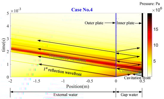 When the foundation of the inner plate is stiff, i.e., KS equals to 5 × 1010 Pa/m, the temporal and spatial distribution of fluid pressure in both external and gap water is plotted in Figure 12. Contrary to the observations in Figure 10, there is scarcely any cavitation in either the external or gap water. However, in the gap water, static cavitation still initiates adjacent to the inner plate and propagates towards the outer plate. Upon the transmitted wave from the outer plate encountering the cavitation front in the gap water, the static cavitation begins to collapse, with the collapsing front advancing towards the inner plate. Subsequently, cavitation is virtually nonexistent due to the rigidity of the support spring KS. The stiff KS restricts the movement of the inner plate, thereby curbing the occurrence of cavitation. Consequently, the shock wave within the gap water reflects back and forth between the outer and inner plates. Furthermore, distinct wave fronts are observed as indicated by the black arrows in both external and gap water. Each time the shock loading in gap water impacts the outer plate, a transient peak pressure emerges in the external fluid.