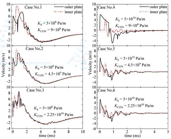 Time histories of the velocities of the outer and inner plates for the six cases.