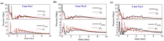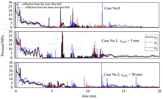 The time history of pressure on three different fluid-structure interaction surfaces for cases No. 0, 1, and 2.