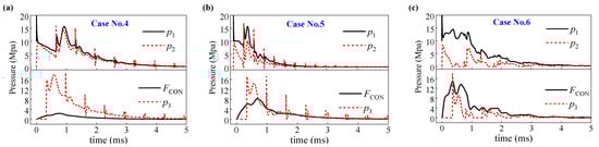 Figure 14 and Figure 15 plot the dynamic pressure exerted upon the fluid-solid interface and the force transmitted by the connection spring, KCON. Within these figures, p1, p2, and p3 are the pressures at the interface of the external water with the outer plate, the outer plate with the gap water, and the gap water with the inner plate, respectively. FCON is the spring force of KCON. When the incident shock wave impinged on the outer plate, a sharp peak of p1 appeared due to the instantaneous reflection wave. This phenomenon occurs within an exceedingly brief duration, and the plate nearly has no opportunity to undergo displacement. In the subsequent reaction, the pivotal roles are assumed by KCON and KS. The behavior of the support spring, KS, is principally instrumental in dictating the cavitation phenomena within the external and gap water. With a soft KS, the inner plate exhibits rapid motion, leading to cavitation in both the external and gap water. Conversely, in the case with rigid KS, cavitation is almost nonexistent due to the minimal movement of the inner plate. The connecting spring, KCON, primarily influences the transmission of load to the inner plate. With a softer KCON, the force exerted by the connecting spring is diminished, resulting in comparable pressures on the coupling surfaces p1 and p2. However, as the stiffness of KCON increases, the connecting force FCON correspondingly amplifies, leading to a reduction in pressure on the coupling surface p2 compared to p1.