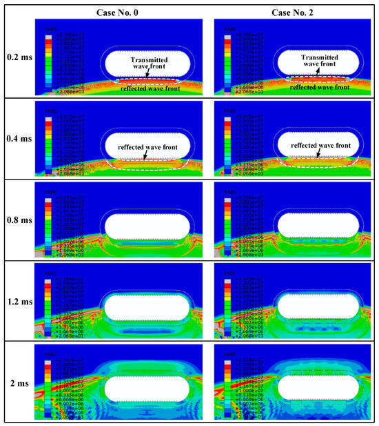 The findings suggest that the connecting structures between the outer and inner hulls exert minimal influence on the propagation of the shock wave, and only the results of cases No. 0 and 2 are represented in Figure 16. When the incident wave impinges on the outer thin hull, it will reflect back into the external water as well as penetrate into the gap water. Since the outer hull is thin, the reflected wave has a narrow wave front, and the shock wave can transmit into the gap water easily, as illustrated at the time instants of 0.2 ms. At the moment the wave transmitted through the gap water strikes the inner hull, specifically at 0.4 ms, the wave reflected from the inner hull is considerably more intense than that reflected from the outer, thinner hull. This is because the inner hull is stiffer than the outer hull. The comparison results between cases No. 0 and 2 reveal that the connecting structures have minimal influence on the reflection and transmission of shock waves at the initial stage. At subsequent stages, the influences of the connecting structures are almost exclusively confined to the pressure localized in their immediate surroundings.