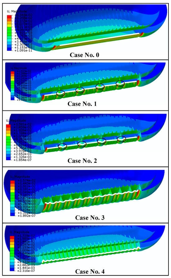 In this section, the structural dynamic response will be discussed when varying the parameters of connecting structures. Figure 18 presents the displacement distribution of structures with differing connecting structures at the time instant of 1 ms. To enhance the visibility of structural deformation, a deformation amplification factor of 10 has been applied. The findings in case No. 0 demonstrate that the outer hull flexes inward uniformly. In models with connecting structures, the motion of the outer hull near the connection structure is obviously restricted by the connection structure, that is, the region delineated by an ellipse in the figures. In cases No. 1 and 2, where the connecting structures are spaced 1 m apart, the outer hull between them continues to flex inward uniformly. As the distance between connecting structures is reduced, as in cases No. 3 and 4, the outer hull begins to exhibit a distinct wave-like deformation.