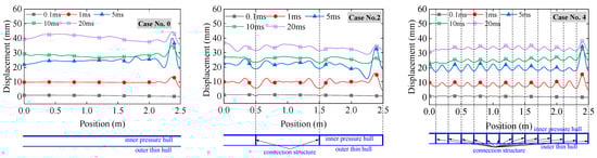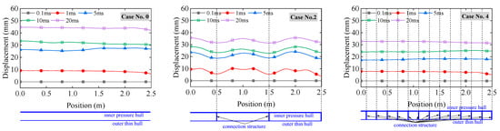 The displacement response of the inner hull on the side of the explosion source at different time instants for cases No. 0, 2, and 4.