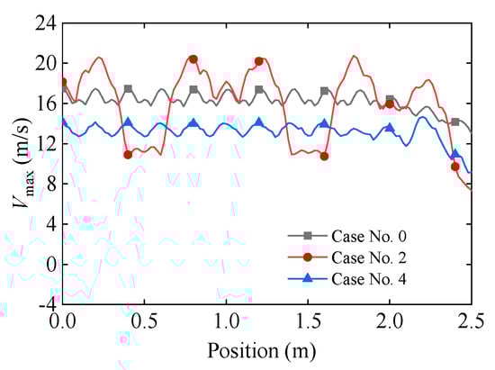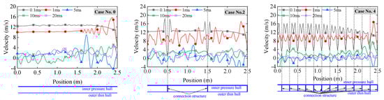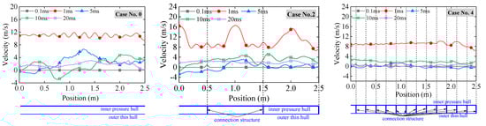 Figure 22 depicts the velocity response of the inner hull on the explosion source side at various time instants. The velocity response behavior of the inner hull is consistent with that of the outer hull, characterized by a rapid increase in velocity at the onset of the shock wave. At the time instant of 1 ms, the velocity of the inner shell reaches approximately 11 m/s in case No. 0. For case No. 2, the velocity of the localized inner hull, which is affixed to the connecting structures, approximates 8.5 m/s. Conversely, the remainder of the inner hull, nestled between the two connecting structures, exhibits a velocity nearing 16 m/s. Regarding case No. 4, the velocity of the inner hull is uniformly distributed, averaging 8 m/s. Given that the shock response of the inner hull reflects the shock conditions experienced by the internal apparatus, it proves advantageous to integrate the connecting structures to mitigate the shock environment. Comparative analysis of cases No. 2 and 4 reveals that, under the condition of equivalent mass, increasing the distribution density of the connecting structures is more conducive to reducing the shock response of the inner shell. Naturally, augmenting the distribution density of the connecting structures entails a reduction in the stiffness of each individual connecting structure. To further prove this phenomenon, the peak velocity results at various positions on the blast-facing surface of the inner hull for cases No. 0, 2, and 4 are presented in Figure 23. For a double-hulled cylindrical shell with considerable thickness yet sparse distribution, as shown in case No. 2, the maximal velocity response of the inner hull in areas proximate to the connecting structure is less than that of case No. 0, whereas the maximal velocity response of the inner hull between connecting structures exceeds the results of case No. 0. However, in case No. 4, the maximal velocity of the inner hull uniformly falls below the results observed in case No. 0, achieving a diminution rate of 19%. Hence, connecting structures that are pliant and relatively densely distributed can effectively mitigate the impact response of the inner pressure hull.