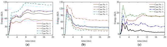 The findings presented above indicate that the connecting structures are expected to improve the shock resistance of the double-layer cylindrical shell, primarily manifested in the diminution of the inner hull’s impact response. The results depicted in Figure 24 will further examine the influence of the connecting structures on the shock response from the perspective of the strain energy. As illustrated in Figure 24a, the strain energy of the outer hull attains its minimum in the absence of connecting structures (case No. 0). Upon the incorporation of the connecting structures, there is a noticeable augmentation in the strain energy of the outer hull. Furthermore, this strain energy intensifies as the connecting structure becomes more densely arranged, indicating a direct correlation between the density of the connection structure and the hull’s strain energy. This phenomenon can be elucidated through the deformation mode of the outer hull. As depicted in Figure 18, in the absence of connecting structures, the outer hull predominantly undergoes uniform deformation. However, upon the integration of the connecting structures, the hull exhibits a wavy deformation attributed to the localized constraints imposed by the connecting structures. The denser the distribution of the connecting structures, the more pronounced the wavy deformation becomes. Evidently, the elongation of the outer hull experiencing wave-like deformation surpasses that of uniformly deformed hulls, culminating in an elevated strain energy in the outer hull for the cases with connecting structures.