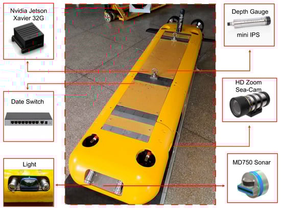 The general diagram of the ARV is shown in Figure 1. It is equipped with two stern thrusters, two front and rear vertical thrusters, and one side thruster each, which can realize six degrees of freedom of control [30]. The thrust of the stern thruster is 50 kgf, the thrust of the vertical thruster is 80 kgf, and the thrust of the side thruster is 50 kgf. The maximum speed it can reach in the water is 8 kn, and the power source is an 80 Ah Li-ion battery. The ARV uses inertial guidance to realize underwater localization and navigation, and uses instruments such as a depth gauge and an altimeter to obtain the height and depth information of the ARV itself in the water. The ARV is equipped with a front view camera, a front view sonar, and two side view cameras. In the experiment, as shown in Figure 2, a gantry crane is used to put in and take out the pipeline to simulate the pipeline-laying process, while the ARV dives into the water to detect and identify the location of the pipeline’s seabed-contacting segment to realize autonomous tracking.