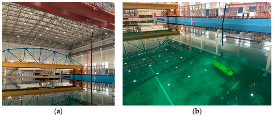 The main body of the experimental tank is 50 m long, 40 m wide, and 10 m deep, with a gantry crane spanning over the tank to tow and lift the simulated offshore pipe. There is an indoor natural light illuminance of 15~200 lux, an underwater ambient light illuminance of 5~40 lux, water-scattering turbidity of 9~15 NTU, and a particulate suspended matter concentration of approximately 0.6 g/cm3.