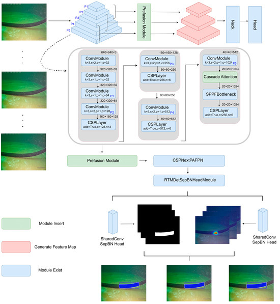 In the process of laying pipelines, the complex operating environment of the seabed can cause the silt on the seabed to adhere to the surface of the pipeline, forming a layer of irregular silt film. At the same time, the light source from the underwater ARV is absorbed and scattered by the seawater, which causes the image of the pipeline in the model’s field of view to merge with the background color of the silt on the seabed, blurring the boundary between the pipeline and the background. To address this problem, we propose the prefusion module, which enables the network to enhance the fine-grained information about the boundaries by fusing feature maps to improve the performance of the model in detecting boundary segmentation.