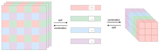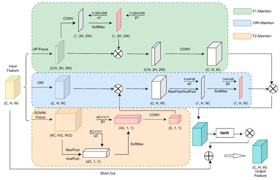 The focus module is used as a down-sampling method in the network model instead of the traditional convolution method, which combines the spatial pixel information sequentially in the direction of the depth channel. This effectively reduces the number of layers in the network model, reduces the number of model parameters during training, and improves the speed of forward and backward propagation. Based on focus, we propose and design a reverse up-sampling that fuses the depth direction information with space and realizes the information fusion interaction between space and channel direction. It is used as the original input image for various attention operations and tries to realize the attention fusion of different sizes of space and channel to improve the performance of the model. As shown in Figure 6, up-focus and down-focus are mutually inverse operations that can obtain F1 and F2 feature maps.