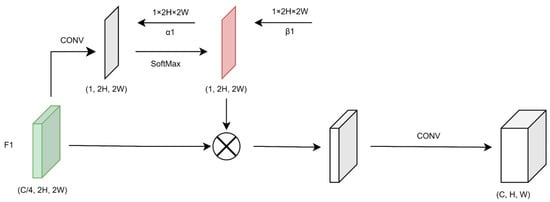 For the input feature map F1, we use a convolution kernel of size 1 to map the feature map to the feature map with channel 1, which assigns a self-learning parameter to each pixel of the feature map. This is used to represent the relationship of each pixel with the global feature map. The convolved feature map is multiplied by the feature map F1 according to the global SoftMax. At the same time, it must be converted back into the number of channels of the ORI feature map through the convolution operation to obtain the output of the feature map of the positioning semantic enhancement module, F1′, in order to perform the fusion operation in the next step.