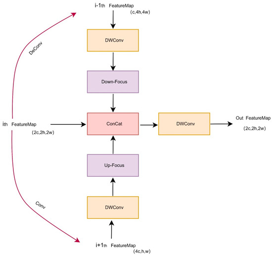 The specific sequence of feature map processing is shown in Figure 10. First, we take the feature map, the feature map, and the feature map as inputs. For the feature map, we use the de-conv operation to up-sample the feature map to the size of (C, 4H, 4W) and add it to the feature map, and the result is nonlinearly transformed by DW convolution. In DW convolution, we adopt the expansion convolution kernel with an expansion coefficient of 2, so that the feature map can obtain a larger sense field in the nonlinear transformation, while at the same time, the DW convolution can effectively reduce the model parameters and reduce the extra overhead in the modeling process. The feature map output by the DW convolution is then reduced to the size of (2C, 2H, 2W) by the down-focus module designed above. Similarly, for the feature map of size (4C, H, W), the feature map is enlarged to (2C, 2H, 2W) using the nonlinear DW convolution and the up-focus operation, respectively. Next, the feature map, the feature map, and the feature map processed above are stacked with the feature map using the concat operation, and finally transformed back to the size of the feature map by the DW-conv operation and output.