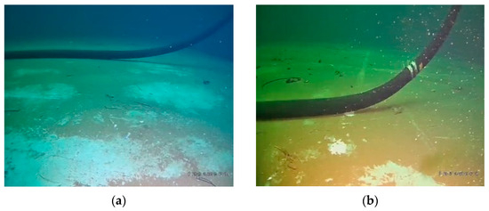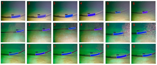 The results of the image inference sequences under three different environmental conditions are shown in Figure 17. The image size detected by the ARV is 575 × 704, the inference speed of the image on the model reaches 36 FPS, and the accuracy rate of image inference reaches more than 95%, realizing the task of tracking and detecting the seabed-contacting segment of the underwater ARV in the process of oil pipeline laying and fully proving the effectiveness of our proposed module.