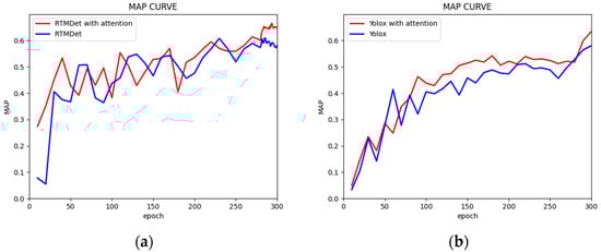 Precision performance comparison. (a) mAP curve of RTMDet network; (b) mAP curve of YOLOX network.