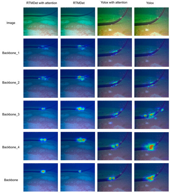 To better demonstrate the effectiveness of the cascade attention module, we apply Grad-CAM to the RTMDet and YOLOX network models, respectively, to visualize images from the subsea seabed-contacting segment detection dataset. Grad-CAM generates heat maps for the input images and is able to clearly visualize the image positions from which the network learns and on which it focuses. Figure 13 compares the visualization results of the network baseline with those of the additional cascade attention module and shows, in particular, the feature attention maps in the backbone phase. It is clear that the network with cascade attention can focus on the target object better than the baseline network in the third and fourth feature maps of the backbone.